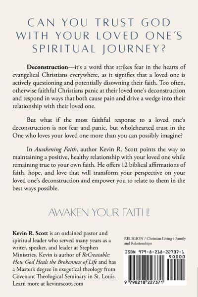 Evangelical Christians everywhere are wrestling with the reality of loved ones-children, spouses, friends, fellow church members-who are actively deconstructing their faith. Filled with fear and concern for their loved ones, these faithful Christians too often respond in panicked ways that cause pain to their loved one and drive a wedge into their relationship with them. What if there were a way for evangelical Christians to maintain a healthy relationship with their deconstructing loved ones, while at the same time being true to their own faith? Author Kevin Scott believes this is what most Christians truly want, and his new book, Awakening Faith, shows them the way. The key is found in verses that exhort us to "take captive every thought" (2 Cor. 10:5) and "think on these things" (Phil. 4:8). Awakening Faith offers a biblical way to think about a loved one's deconstruction that sees God's hand on their spiritual journey every step of the way. It offers 12 biblical affirmations of faith, hope, and love. It invites readers to trust God with their loved one's spiritual journey, even when they don't fully understand where it's heading. This compassionate, practical guide will strengthen readers' faith and help them have a positive, meaningful, long-lasting relationship with their deconstructing loved one.