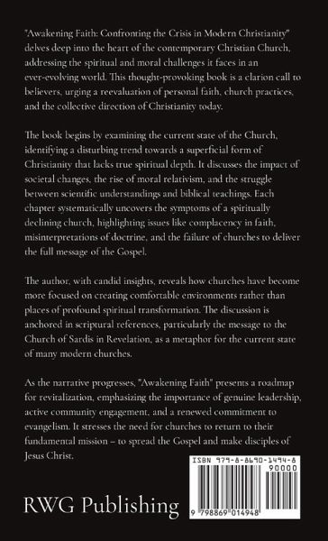 "Awakening Faith: Confronting the Crisis in Modern Christianity" delves deep into the heart of the contemporary Christian Church, addressing the spiritual and moral challenges it faces in an ever-evolving world. This thought-provoking book is a clarion call to believers, urging a reevaluation of personal faith, church practices, and the collective direction of Christianity today. The book begins by examining the current state of the Church, identifying a disturbing trend towards a superficial form of Christianity that lacks true spiritual depth. It discusses the impact of societal changes, the rise of moral relativism, and the struggle between scientific understandings and biblical teachings. Each chapter systematically uncovers the symptoms of a spiritually declining church, highlighting issues like complacency in faith, misinterpretations of doctrine, and the failure of churches to deliver the full message of the Gospel. The author, with candid insights, reveals how churches have become more focused on creating comfortable environments rather than places of profound spiritual transformation. The discussion is anchored in scriptural references, particularly the message to the Church of Sardis in Revelation, as a metaphor for the current state of many modern churches. As the narrative progresses, "Awakening Faith" presents a roadmap for revitalization, emphasizing the importance of genuine leadership, active community engagement, and a renewed commitment to evangelism. It stresses the need for churches to return to their fundamental mission - to spread the Gospel and make disciples of Jesus Christ. In its conclusion, the book offers hope and guidance for a spiritual reawakening. It calls on Christians to emerge from their comfort zones, embrace their calling, and actively participate in the mission of the Church. "Awakening Faith" is not just a critique but a transformative guide that aims to ignite a passion for a more authentic, vibrant, and effective Christian witness in the 21st century. Ideal for pastors, church leaders, and lay Christians alike, this book serves as a wake-up call and a beacon of hope for anyone concerned about the future of Christianity in a rapidly changing world. "Awakening Faith" is an essential read for those yearning for a revival in their personal faith journey and in the life of the Church at large.