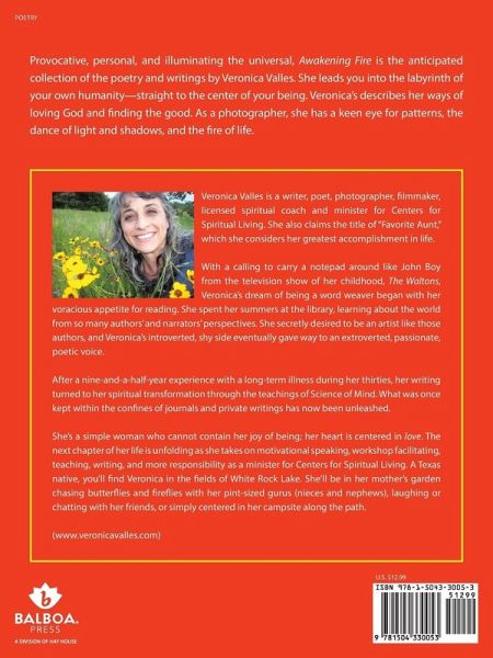 Provocative, personal, and illuminating the universal, Awakening Fire is the anticipated collection of the poetry and writings by Veronica Valles. She leads you into the labyrinth of your own humanity-straight to the center of your being. Veronica's describes her ways of loving God and finding the good. As a photographer, she has a keen eye for patterns, the dance of light and shadows, and the fire of life.