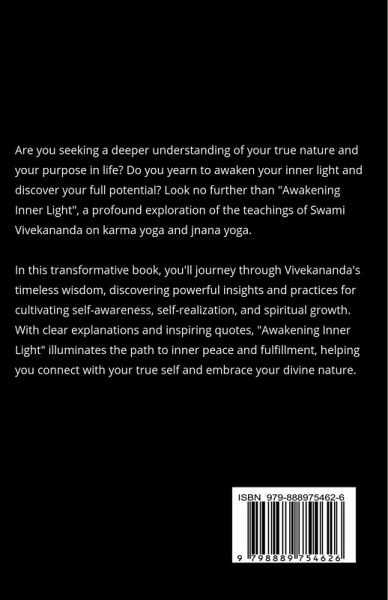 Are you seeking a deeper understanding of your true nature and your purpose in life? Do you yearn to awaken your inner light and discover your full potential? Look no further than ""Awakening Inner Light"", a profound exploration of the teachings of Swami Vivekananda on karma yoga and jnana yoga. In this transformative book, you'll journey through Vivekananda's timeless wisdom, discovering powerful insights and practices for cultivating self-awareness, self-realization, and spiritual growth. With clear explanations and inspiring quotes, ""Awakening Inner Light"" illuminates the path to inner peace and fulfillment, helping you connect with your true self and embrace your divine nature.