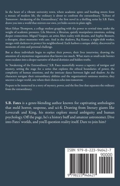 Echoes of Tomorrow: Awakening of the Extraordinary - A Mystery of Superpowers and Secrets in an Urban University Town by S.B. Fates Overview In "Echoes of Tomorrow: Awakening of the Extraordinary," S.B. Fates crafts a gripping tale of mystery and wonder set against the vibrant backdrop of a bustling university town. This first book in a thrilling series weaves a complex narrative where modern architecture meets hidden powers, and the ordinary intersects with the extraordinary. Plot In a world mirroring our own, a diverse group of individuals in a university town stumbles upon extraordinary abilities. From Ethan, the college student who can rewind time under academic pressure, to Lila, the librarian who manipulates emotions for deeper connection, each character confronts the ethical dilemmas of their newfound powers. As they navigate personal growth and complex interpersonal relationships, their actions catch the eye of a mysterious organization. Their journey of self-discovery takes a darker turn, hinting at a deeper connection and a shared destiny shrouded in secrecy. Key Elements Urban Fantasy & University Setting: A perfect blend of a contemporary urban environment with a twist of the supernatural. Diverse Characters & Superpowers: From time manipulation to merging with shadows, each character's unique ability adds depth to this character-driven story. Mysterious Organization & Ethical Dilemmas: The narrative expertly explores the moral complexities of using supernatural abilities, set against the backdrop of a secret society. Conflict and Resolution: Engage with a plot rich in tension, mystery, and resolution, as characters grapple with both internal and external conflicts. Modern Architecture & Hidden Powers: Explore the visually rich setting where historical and modern architecture harbors secrets and powers waiting to be discovered. For Readers Who Love Urban fantasy with a mystery twist. Character-driven narratives with psychological depth. Stories blending fantasy and reality with ethical questions. Books featuring a mix of supernatural abilities and real-world challenges. Join the journey in "Echoes of Tomorrow: Awakening of the Extraordinary," where each turn of the page brings a deeper dive into a world of secrets, powers, and unexpected alliances. This book is a must-read for fans of urban fantasy, mystery, and character-driven adventures. Get ready to be immersed in a story where every character's choice resonates with the echoes of tomorrow.