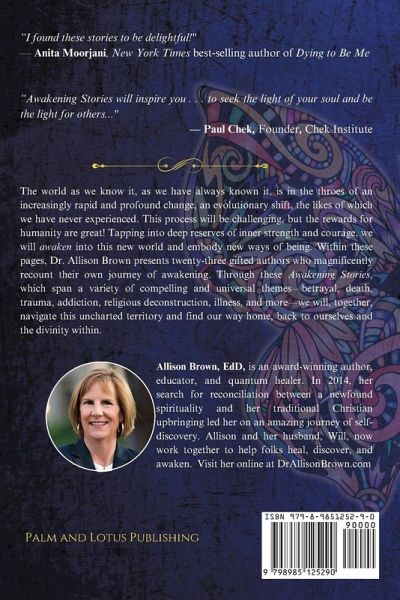 The world as we know it, as we have always known it, is in the throes of an increasingly rapid and profound change, an evolutionary shift, the likes of which we have never experienced. This process will be challenging, but the rewards for humanity are great! Tapping into deep reserves of inner strength and courage, we will awaken into this new world and embody new ways of being. Within these pages, Dr. Allison Brown presents twenty-three gifted authors who magnificently recount their own journey of awakening. Through these Awakening Stories, which span a variety of compelling and universal themes-betrayal, death, trauma, addiction, religious deconstruction, illness, and more-we will, together, navigate this uncharted territory and find our way home, back to ourselves and the divinity within. "I found these stories to be delightful!" - Anita Moorjani, New York Times best-selling author of Dying to Be Me "Awakening Stories will inspire you . . . to seek the light of your soul and be the light for others..." - Paul Chek, Founder, Chek Institute