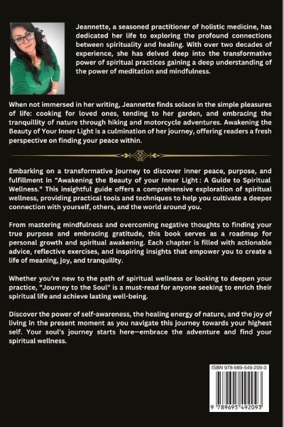 Embarking on a transformative journey to discover inner peace, purpose, and fulfillment in "Awakening the Beauty of your Inner Light: A Guide to Spiritual Wellness." This insightful guide offers a comprehensive exploration of spiritual wellness, providing practical tools and techniques to help you cultivate a deeper connection with yourself, others, and the world around you. From mastering mindfulness and overcoming negative thoughts to finding your true purpose and embracing gratitude, this book serves as a roadmap for personal growth and spiritual awakening. Each chapter is filled with actionable advice, reflective exercises, and inspiring insights that empower you to create a life of meaning, joy, and tranquility. Whether you're new to the path of spiritual wellness or looking to deepen your practice, "Journey to the Soul" is a must-read for anyone seeking to enrich their spiritual life and achieve lasting well-being. Discover the power of self-awareness, the healing energy of nature, and the joy of living in the present moment as you navigate this journey towards your highest self. Your soul's journey starts here-embrace the adventure and find your spiritual wellness.