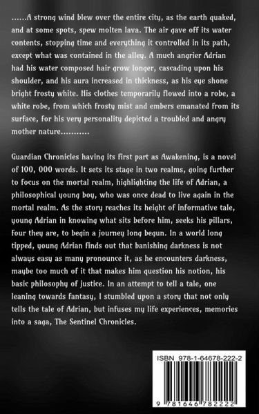 ......Astrongwindblewovertheentirecity,astheearthquaked,andatsomespots,spewmoltenlava.Theairgaveoffitswatercontents,stoppingtimeandeverythingitcontrolledinitspath,exceptwhatwascontainedinthealley.AmuchangrierAdrianhadhiswatercomposedhairgrowlonger,cascadinguponhisshoulder,andhisauraincreasedinthickness,ashiseyeshonebrightfrostywhite.Hisclothestemporarilyflowedintoarobe,awhiterobe,fromwhichfrostymistandembersemanatedfromitssurface,forhisverypersonalitydepictedatroubledandangrymothernature........... GuardianChronicleshavingitsfirstpartasAwakening,isanovelof100,000words.Itsetsitsstageintworealms,goingfurthertofocusonthemortalrealm,highlightingthelifeofAdrian,aphilosophicalyoungboy,whowasoncedeadtoliveagaininthemortalrealm.Asthestoryreachesitsheightofinformativetale,youngAdrianinknowingwhatsitsbeforehim,seekshispillars,fourtheyare,tobeginajourneylongbegun.Inaworldlongtipped,youngAdrianfindsoutthatbanishingdarknessisnotalwayseasyasmanypronounceit,asheencountersdarkness,maybetoomuchofitthatmakeshimquestionhisnotion,hisbasicphilosophyofjustice.Inanattempttotellatale,oneleaningtowardsfantasy,IstumbleduponastorythatnotonlytellsthetaleofAdrian,butinfusesmylifeexperiences,memoriesintoasaga,TheSentinelChronicles.