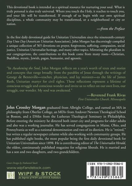 This devotional book is intended as a spiritual resource for nurturing your soul. What is truly personal is also truly universal. Where you touch the Holy, it reaches to touch you, and your life will be transformed. If enough of us begin with our own spiritual disciplines, a whole community may be transformed, or a neighborhood or city or nation. --from the Preface In the first daily devotional guide for Unitarian Universalists since the nineteenth-century Day Unto Day (American Unitarian Association), John Morgan has discerningly compiled a unique collection of 365 devotions on prayer, forgiveness, suffering, compassion, social justice, Unitarian Universalist heritage, and many other topics. Mirroring the pluralism in our congregations, the contributions to this book come from many roots--Christian, Buddhist, mystic, Jewish, pagan, humanist, and agnostic. "In Awakening the Soul, John Morgan reflects on a year's worth of texts and stories and concepts that range broadly from the parables of Jesus through the writings of George de Benneville--teacher, physician, and lay minister--to the life of James Reeb, Unitarian martyr for civil rights. These reflections represent a lifetime of conscious struggle and conscious wonder and invite us to reflect on our own lives, our struggle, our wonder. My soul was awakened." --Reverend Frank Rivas, First Universalist Church, Minneapolis John Crossley Morgan graduated from Albright College, and earned an MA in philosophy from Oberlin College, an MDiv from Andover Newton Theological School in Boston, and a DMin from the Lutheran Theological Seminary in Philadelphia. Before entering the ministry, he directed both inner-city and rural programs for older adults and also was a working journalist. He has served congregations in Maine, Ohio, and Pennsylvania as well as a national denomination and two of its districts. He is "retired," but writes a regular newspaper column while also working with community groups. He has published eight books, the most popular being the first daily devotional book for Unitarian Universalists since 1898. He is contributing editor of The Universalist Herald, the oldest, continuously published magazine for religious liberals. He is married and has a son and two daughters, and two grandchildren.