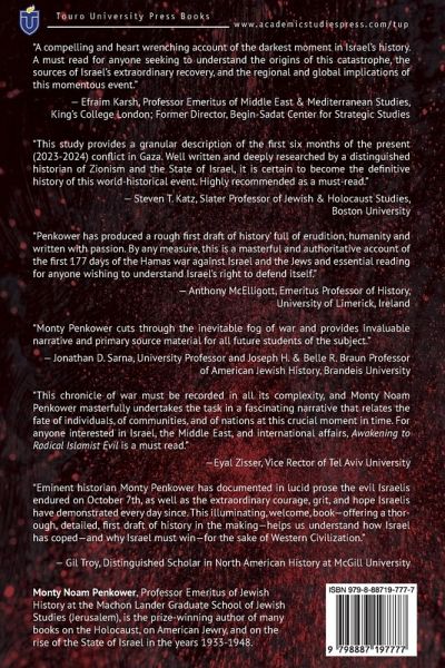 This volume offers the first daily account of the war forced upon the State of Israel by Hamas's brutal attack on its southern communities near the Gaza Strip on October 7, 2023. Focusing on the initial six months of that war, Professor Monty Penkower examines in detail its local, regional, and international significance. Joining extensive research and a limpid prose, as in his many other books on modern Jewish history, this prize-winning historian again displays a definitive mastery of his craft.