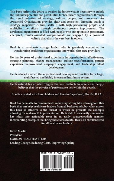 This book reflects the desire to awaken leaders to what is necessary to unlock the unlimited potential and possibilities for healthcare organizations through the synchronization of strategy, culture, people, and processes. An Awakened Organization provides clear and consistent direction, builds a strategy-supportive culture, staffs it with high-performing people, and multiplies the efforts through continuous process improvement. The awakened organization is filled with people who are optimistic, passionate, energized, results-oriented, compassionate, and engaged by a powerful culture that elicits the very best in others.