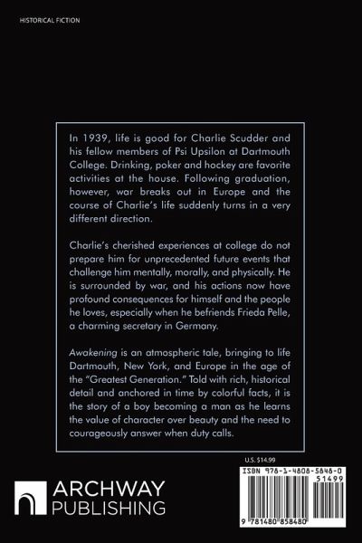 In 1939, life is good for Charlie Scudder and his fellow members of Psi Upsilon at Dartmouth College. Drinking, poker and hockey are favorite activities at the house. Following graduation, however, war breaks out in Europe and the course of Charlie's life suddenly turns in a very different direction. Charlie's cherished experiences at college do not prepare him for unprecedented future events that challenge him mentally, morally, and physically. He is surrounded by war, and his actions now have profound consequences for himself and the people he loves, especially when he befriends Frieda Pelle, a charming secretary in Germany. Awakening is an atmospheric tale, bringing to life Dartmouth, New York, and Europe in the age of the "Greatest Generation." Told with rich, historical detail and anchored in time by colorful facts, it is the story of a boy becoming a man as he learns the value of character over beauty and the need to courageously answer when duty calls.