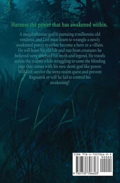 A megalomaniac god is pursuing a millennia-old vendetta, and Leif must learn to wrangle a newly awakened power to either become a hero or a villain. He will leave his old life and run from creatures he believed were reserved for myth and legend. He travels across the realms while struggling to tame the blinding rage that comes with his new demi-god like power. Will Leif survive the intra-realm quest and prevent Ragnarok or will he fail to control his awakening?