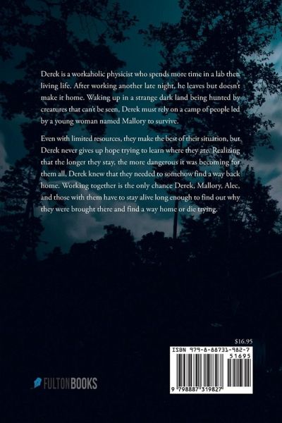 Derek is a workaholic physicist who spends more time in a lab then living life. After working another late night, he leaves but doesn't make it home. Waking up in a strange dark land being hunted by creatures that can't be seen, Derek must rely on a camp of people led by a young woman named Mallory to survive. Even with limited resources, they make the best of their situation, but Derek never gives up hope trying to learn where they are. Realizing that the longer they stay, the more dangerous it was becoming for them all, Derek knew that they needed to somehow find a way back home. Working together is the only chance Derek, Mallory, Alec, and those with them have to stay alive long enough to find out why they were brought there and find a way home or die trying.