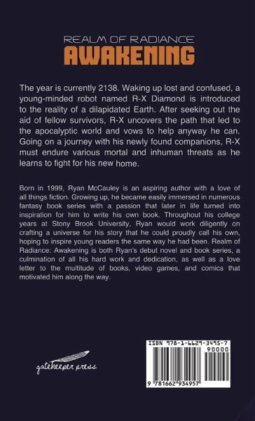 The year is currently 2138. Waking up lost and confused, a young-minded robot named R-X Diamond is introduced to the reality of a dilapidated Earth. After seeking out the aid of fellow survivors, R-X uncovers the path that led to the apocalyptic world and vows to help anyway he can. Going on a journey with his newly found companions, R-X must endure various mortal and inhuman threats as he learns to fight for his new home. Awakening is the first book in the Realm of Radiance series, a continuous science-fantasy filled adventure that anyone can enjoy and get lost in.