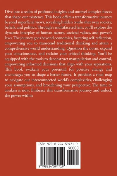 Dive into a realm of profound insights and unravel complex forces that shape our existence. This book offers a transformative journey beyond superficial views, revealing hidden truths that sway society, beliefs, and politics. Through a multifaceted lens, you'll explore the dynamic interplay of human nature, societal values, and power's laws. The journey goes beyond economics, fostering self-reflection, empowering you to transcend traditional thinking and attain a comprehensive world understanding. Question the norm, expand your consciousness, and reclaim your critical thinking. You'll be equipped with the tools to deconstruct manipulation and control, empowering informed decisions that align with your aspirations. This book awakens your potential for positive change and encourages you to shape a better future. It provides a road map to navigate our interconnected world's complexities, challenging your assumptions, and broadening your perspective. The time to awaken is now. Embrace this transformative journey and unlock the power within
