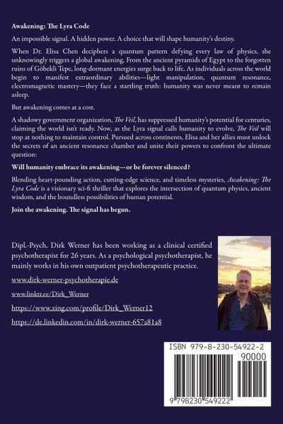 Awakening: The Lyra Code An impossible signal. A hidden power. A choice that will shape humanity's destiny. When Dr. Elisa Chen deciphers a quantum pattern defying every law of physics, she unknowingly triggers a global awakening. From the ancient pyramids of Egypt to the forgotten ruins of Göbekli Tepe, long-dormant energies surge back to life. As individuals across the world begin to manifest extraordinary abilities-light manipulation, quantum resonance, electromagnetic mastery-they face a startling truth: humanity was never meant to remain asleep. But awakening comes at a cost. A shadowy government organization, The Veil, has suppressed humanity's potential for centuries, claiming the world isn't ready. Now, as the Lyra signal calls humanity to evolve, The Veil will stop at nothing to maintain control. Pursued across continents, Elisa and her allies must unlock the secrets of an ancient resonance chamber and unite their powers to confront the ultimate question: Will humanity embrace its awakening-or be forever silenced? Blending heart-pounding action, cutting-edge science, and timeless mysteries, Awakening: The Lyra Code is a visionary sci-fi thriller that explores the intersection of quantum physics, ancient wisdom, and the boundless possibilities of human potential. Perfect for fans of Michael Crichton, Blake Crouch, and Andy Weir. Join the awakening. The signal has begun.