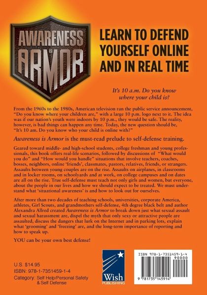 From the 1960s to the 1980s, American television ran the public service announcement, "Do you know where your children are," with a large 10 p.m. logo next to it. The idea was if our nation's youth were indoors by 10 p.m., they would be safe. The reality, however, is bad things can happen any time. Today, the new question should be, "It's 10 am. Do you know who your child is online with?" Awareness is Armor is the must-read prelude to self-defense training. Geared toward middle- and high-school students, college freshman and young professionals, this book offers real-life scenarios, followed by discussions of "What would you do" and "How would you handle" situations that involve teachers, coaches, bosses, neighbors, online 'friends', classmates, pastors, relatives, friends, or strangers. Assaults between young couples are on the rise. Assaults on airplanes, in classrooms and in locker rooms, on schoolyards and at work, on college campuses and on dates are all on the rise. True self-defense must teach not only girls and women, but everyone, about the people in our lives and how we should expect to be treated. We must understand what 'situational awareness' is and how to look out for ourselves. After more than two decades of teaching schools, universities, corporate America, athletes, Girl Scouts, and grandmothers self-defense, 4th degree black belt and author Alexandra Allred created Awareness is Armor: Learn to Defend Yourself Online and in Real TIme to break down just what sexual assault and sexual harassment are, dispel the myth that only sexy or attractive people are assaulted, discuss the dangers that lurk on the Internet and in parking lots, explain what ‘grooming’ and ‘freezing’ are, and the long-term importance of reporting and how to speak up. You must be your own champion!