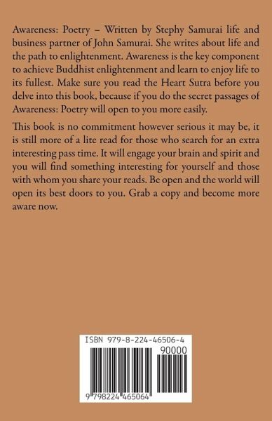 Awareness: Poetry - Written by Stephy Samurai life and business partner of John Samurai. She writes about life and the path to enlightenment. Awareness is the key component to achieve Buddhist enlightenment and learn to enjoy life to its fullest. Make sure you read the Heart Sutra before you delve into this book, because if you do the secret passages of Awareness: Poetry will open to you more easily. This book is no commitment however serious it may be, it is still more of a lite read for those who search for an extra interesting pass time. It will engage your brain and spirit and you will find something interesting for yourself and those with whom you share your reads. Be open and the world will open its best doors to you. Grab a copy and become more aware now.
