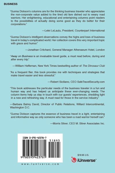 "Gunna Dickson's columns are for the thinking business traveler who appreciates the non-corporate value added to the tired old fare dished out to weary road warriors. Her enlightening, educational and entertaining columns point readers to the possibilities of actually doing some good as they do better for their corporations." -Lelei LeLaulu, President, Counterpart International "Gunna Dickson's intelligent observations convey the highs and lows of business travel in today's complicated world. Her collection covers this very important topic with grace and humor." -Jonathan Critchard, General Manager Athenaeum Hotel, London "Away on Business is an invaluable travel guide, a must read before, during and after every trip." -William Heffernan, New York Times bestselling author of The Dinosaur Club "As a frequent flier, this book provides me with techniques and strategies that make travel easier and less stressful." -Robert Siciliano, CEO SafeTravelSecurity.com "This book addresses the particular needs of the business traveler in a fun and human way and has helped us anticipate these ever-changing needs. The column items help us stay in touch with our guests' experiences, shedding light in a new and refreshing way. A must read for those in the service industry." -Barbara Bahny David, Director of Public Relations, Willard Intercontinental, Washington D.C. "Gunna Dickson captures the essence of business travel in a light, entertaining and informative way as only someone who has been a road warrior herself can." -Morris Silver, CEO M. Silver Associates Inc.