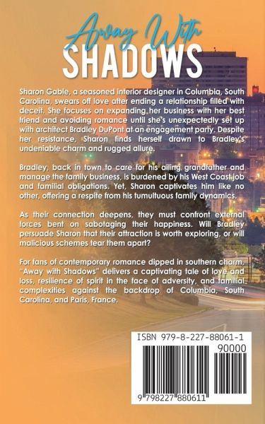Sharon Gable, a seasoned interior designer in Columbia, South Carolina, swears off love after ending a relationship filled with deceit. She focuses on expanding her business with her best friend and avoiding romance until she's unexpectedly set up with architect Bradley DuPont at an engagement party. Despite her resistance, Sharon finds herself drawn to Bradley's undeniable charm and rugged allure. Bradley, back in town to care for his ailing grandfather and manage the family business, is burdened by his West Coast job and familial obligations. Yet, Sharon captivates him like no other, offering a respite from his tumultuous family dynamics. As their connection deepens, they must confront external forces bent on sabotaging their happiness. Will Bradley persuade Sharon that their attraction is worth exploring, or will malicious schemes tear them apart? For fans of contemporary romance dipped in southern charm, "Away with Shadows" delivers a captivating tale of love and loss, resilience of spirit in the face of adversity, and familial complexities against the backdrop of Columbia, South Carolina, and Paris, France.