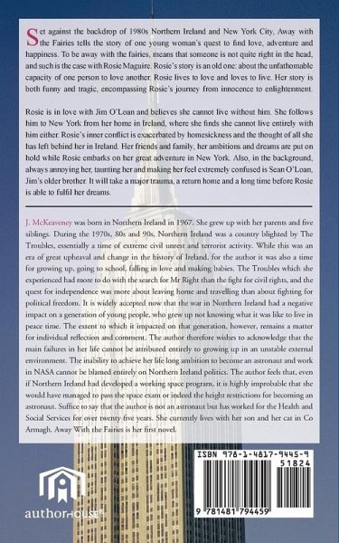 Set against the backdrop of 1980s Northern Ireland and New York City, Away with the Fairies tells the story of one young woman's quest to find love, adventure and happiness. To be away with the fairies, means that someone is not quite right in the head, and such is the case with Rosie Maguire. Rosie's story is an old one: about the unfathomable capacity of one person to love another. Rosie lives to love and loves to live. Her story is both funny and tragic, encompassing Rosie's journey from innocence to enlightenment. Rosie is in love with Jim O'Loan and believes she cannot live without him. She follows him to New York from her home in Ireland, where she finds she cannot live entirely with him either. Rosie's inner conflict is exacerbated by homesickness and the thought of all she has left behind her in Ireland. Her friends and family, her ambitions and dreams are put on hold while Rosie embarks on her great adventure in New York. Also, in the background, always annoying her, taunting her and making her feel extremely confused is Sean O'Loan, Jim's older brother. It will take a major trauma, a return home and a long time before Rosie is able to fulfil her dreams.