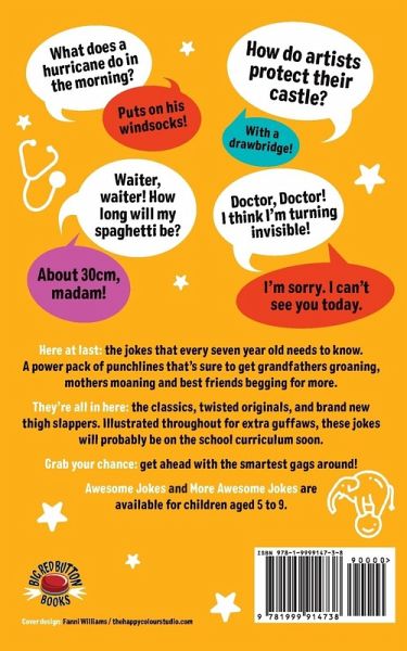What does a hurricane do in the morning?Puts on his windsocks!How do artists protect their castle?With a drawbridge!Doctor, Doctor! I think I'm turning invisible!I'm sorry. I can't see you today!Why do potatoes make the best teachers?Because they have eyes in the back of their heads! Here at last: the funny jokes that every seven year old needs to know, from the million-selling Awesome Jokes series. A power pack of punchlines that's sure to get grandfathers groaning, mothers moaning and best friends begging for more. They're all in here: the classics, twisted originals, and brand new awesome jokes. It's easy to read with illustrations throughout for extra guffaws, making this a book that kids will love from the very first page. Give that seven year old the chance to be top dog with the smartest gags around!