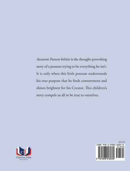 Awesome Possum-bilities is the thought-provoking story of a possum trying to be everything he isn't. It is only when this little possum understands his true purpose that he finds contentment and shines brightest for his Creator. This children's story compels us all to be true to ourselves.