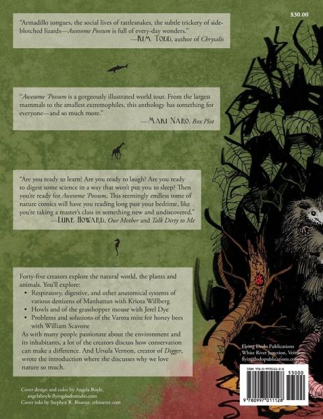 Forty-five creators explore the natural world, the plants and animals. You'll explore: Respiratory, digestive, and other anatomical systems of various denizens of Manhattan with Kriota Willberg Howls and of the grasshopper mouse with Jerel Dye Problems and solutions of the Varroa mite for honey bees with William Scavone As with many people passionate about the environment and its inhabitants, a lot of the creators discuss how conservation can make a difference. And Ursula Vernon, creator of Digger, wrote the introduction where she discusses why we love nature so much.