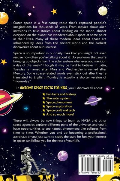 Outer space is a fascinating topic that's captured people's imaginations for thousands of years. From movies about alien invasions to true stories about landing on the moon, almost everyone on the planet has wondered about space at some point in their lives. Many of these modern ideas about space are influenced by ideas from the ancient world and the earliest discoveries about our universe. Space is so important in our daily lives that you might not even realize how often you're talking about it. Do you know that you're bringing up objects from the solar system whenever you mention a day of the week? Though it may be hard to believe, in Latin, Tuesday is named after Mars and Wednesday is named after Mercury. Some space-related words even stick out after they're translated to English. Monday is actually a shorter version of "moon-day." In SPACE FACTS FOR KIDS, you'll discover all about:Fun facts and history The solar system Space phenomena Space exploration Space craft and tech And so much more! There will always be new things to learn as NASA and other space agencies explore different parts of the universe, and you'll have opportunities to see natural phenomena like eclipses from time to time. Whether you end up becoming a professional astronaut or you just want to study the stars for fun, your interest in space can follow you for the rest of your life.