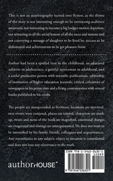 Author had been a spoiled brat in the childhood, an educated achiever in adolescence, a gainful serviceman in adulthood, and a useful productive person with scientific publications, editorship of institution of higher education journals, critical columnist of newspapers in his prime time and a living content retiree with several books published to his credit. The people are masqueraded as fictitious, locations are invented, true events were conjured, places are tainted, characters are made up, twists and turns of the book are magnified, emotional charges are exagerated and timings are misrepresented. He does not want to be intensified by his family, friends, colleagues and acquaintances. Any resemblance to any subject, object or situation is coincidental and does not bear any observance to the truth.