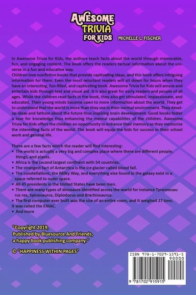 Did You Know? In 2006, Barrack Obama received a Grammy Award for his audiobook voice. Are you interested in learning about the world, the universe, and the galaxy? Awesome Trivia for Kids is a fact book for children containing many universal facts. The world has many interesting facts that captivate everyone especially the children. Many kids have an insatiable thirst for facts about the world starting from dinosaurs, outer space, history, to geography and anything else that their minds can grasp. With the many apps, kits, games, and electronics filling today's world, we might forget that science and fact books continue to be a fascinating and fantastic source of education and entertainment. In Awesome Trivia for Kids, the authors teach facts about the world through memorable, fun, and engaging content. The book offers the readers factual information about the universe in a fun and educative way. These are a few facts which the readers will find interesting:The world is actually a very big and complex place where there are different people, things, and places. Africa is the second largest continent with 54 countries.The strangest fact of Antarctica is the ice glacier called blood fall.The constellations, the Milky Way, and everything else found in the galaxy exist in a space referred to outer space.All 45 presidents in the United States have been men.There are many types of dinosaurs identified across the world for instance Tyrannosaurus rex, Spinosaurus, Diplodocus, and Brachiosaurus.The first computer ever built was the size of an entire room, and it weighed 27 tons. It was called the ENIAC. And many more Start Your Exploration Today By Clicking On The "BUY NOW" Button!