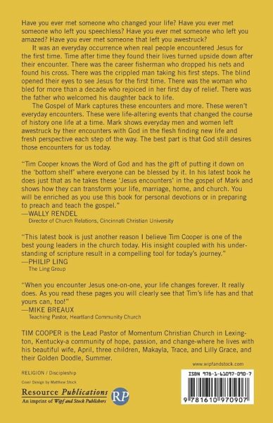 Description: Have you ever met someone who changed your life? Have you ever met someone who left you speechless? Have you ever met someone who left you amazed? Have you ever met someone that left you awestruck? It was an everyday occurrence when real people encountered Jesus for the first time. Time after time they found their lives turned upside down after their encounter. There was the career fisherman who dropped his nets and found his cross. There was the crippled man taking his first steps. The blind opened their eyes to see Jesus for the first time. There was the woman who bled for more than a decade who rejoiced in her first day of relief. There was the father who welcomed his daughter back to life. The Gospel of Mark captures these encounters and more. These weren't everyday encounters. These were life-altering events that changed the course of history one life at a time. Mark shows everyday men and women left awestruck by their encounters with God in the flesh finding new life and fresh perspective each step of the way. The best part is that God still desires those encounters for us today. Endorsements: ""Tim Cooper knows the Word of God and has the gift of putting it down on the 'bottom shelf' where everyone can be blessed by it. In his latest book he does just that as he takes these 'Jesus encounters' in the gospel of Mark and shows how they can transform your life, marriage, home, and church. You will be enriched as you use this book for personal devotions or in preparing to preach and teach the gospel."" --Wally Rendel Director of Church Relations Cincinnati Christian University ""This latest book is just another reason I believe Tim Cooper is one of the best young leaders in the church today. His insight coupled with his understanding of scripture result in a compelling tool for today's journey."" --Philip Ling The Ling Group ""When you encounter Jesus one-on-one, your life changes forever. It really does. As you read these pages you will clearly see that Tim's life has and that yours can, too!"" --Mike Breaux Teaching Pastor Heartland Community Church About the Contributor(s): Tim Cooper is the Lead Pastor of Momentum Christian Church in Lexington, Kentucky-a community of hope, passion, and change-where he lives with his beautiful wife, April, three children, Makayla, Trace, and Lilly Grace, and their Golden Doodle, Summer.