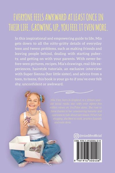 Everyone feels awkward at least once in their life. Growing up, you feel it even more. Mia Fizz is a fifteen-year-old social media star with over 100 million views on her YouTube channel (Mia’s Life). She’s featured in numerous magazines, interviewed stars such as Mark Wahlberg (awkwardly!) and appeared in a sell-out live show alongside her family. This hilarious guide and memoir features Mia’s own drawings and handwriting, never-before-seen pictures, and an empowering message that will help anyone who has ever felt shy, unconfident or awkward to grow beyond these feelings and live their best life. Also featuring an exclusive interview with fellow social media star, Mia’s sister, Super Sienna (who featured on UK’s Little Big Shots presented by Dawn French), plus a fun quiz, hairstyle tutorials and easy vegan recipes, this book will be any young persons go-to to take their life to the next level! Check out Mia’s social medias here: YouTube: https://m.YouTube.com/MiasLife Instagram: https://www.instagram.com/miaslifeofficial/?hl=en