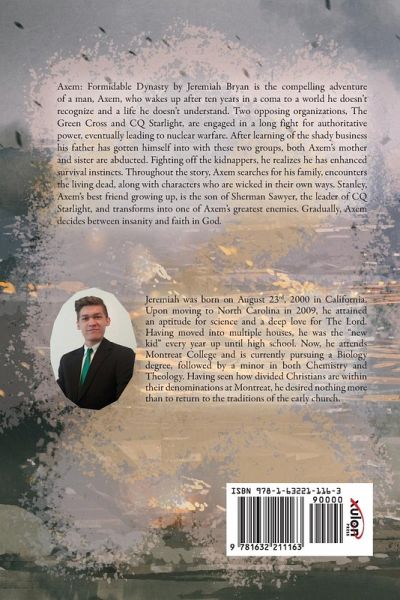 Axem: Formidable Dynasty by Jeremiah Bryan is the compelling adventure of a man, Axem, who wakes up after ten years in a coma to a world he doesn't recognize and a life he doesn't understand. Two opposing organizations, The Green Cross and CQ Starlight, are engaged in a long fight for authoritative power, eventually leading to nuclear warfare. After learning of the shady business his father has gotten himself into with these two groups, both Axem's mother and sister are abducted. Fighting off the kidnappers, he realizes he has enhanced survival instincts. Throughout the story, Axem searches for his family, encounters the living dead, along with characters who are wicked in their own ways. Stanley, Axem's best friend growing up, is the son of Sherman Sawyer, the leader of CQ Starlight, and transforms into one of Axem's greatest enemies. Gradually, Axem decides between insanity and faith in God. Jeremiah was born on August 23rd, 2000 in California. Upon moving to North Carolina in 2009, he attained an aptitude for science and a deep love for The Lord. Having moved into multiple houses, he was the "new kid" every year up until high school. Now, he attends Montreat College and is currently pursuing a Biology degree, followed by a minor in both Chemistry and Theology. Having seen how divided Christians are within their denominations at Montreat, he desired nothing more than to return to the traditions of the early church.