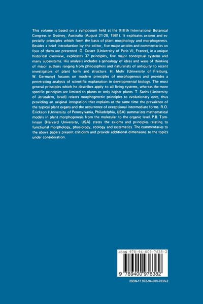 This volume presents the proceedings of a symposium which I organised for the Developmental Section of the Xlllth International Botanical Congress at Sydney, Australia on August 26, 1981. The paper by Professor T. Sachs, which was received too late for inclusion into the symposium at Sydney, was added to these proceedings because of its direct relevancy and importance. The aim of the symposium was to state in an explicit and comprehensive fashion the most basic axioms and principles of plant morphology and morphogenesis. An awareness of these axioms and principles is of paramount importance since they form. the foundations as well as the goal of structural developmental botany. Both teaching and research are predicated on them. The Introduction by the editor briefly examines the meaning of the concepts "axiom", "principle", and "plant construction". The comprehensive paper by Dr. G. Cusset, a unique historical overview, explicates 37 principles of 5 major conceptual systems and many subsystems. The extensive analysis includes a genealogy of ideas and ways of thinking of major authors ranging from philosophers and naturalists of antiquity to recent investigators of plant form and structure. The bibliography of Dr. Cusset I s paper comprises ca. 700 references. The contribution by Professor H. Mohr focusses on modern principles of morphogenesis and provides a penetrating analysis of scientific explanation in developmental biology. The universal principles (laws) described in this paper apply to all living systems, whereas the more specific principles are limited to plants or only higher plants. Professor T.