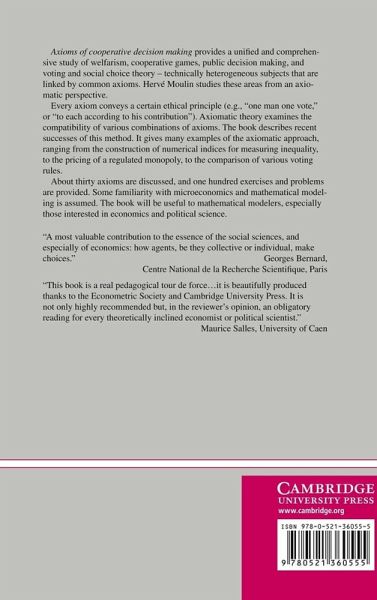 Axioms of Cooperative Decision Making provides a unified and comprehensive study of welfarism, cooperative games, public decision making, and voting and social choice theory - technically heterogeneous subjects that are linked by common axioms. Hervé Moulin studies these areas from an axiomatic perspective. Every axiom conveys a certain ethical principle (e.g. 'one man one vote', or 'to each according to his contribution'). Axiomatic theory examines the compatibility of various combinations of axioms. The book describes recent successes of this method. It gives many examples of the axiomatic approach, ranging from the construction of numerical indices for measuring inequality, to the pricing of a regulated monopoly, to the comparison of various voting rules. The book will be useful to mathematical modellers, especially those interested in economics and political science.