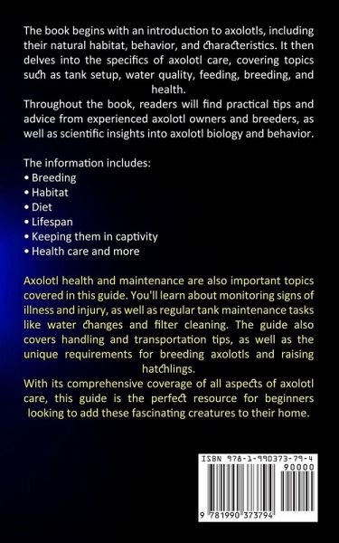 The book begins with an introduction to axolotls, including their natural habitat, behavior, and characteristics. It then delves into the specifics of axolotl care, covering topics such as tank setup, water quality, feeding, breeding, and health. Throughout the book, readers will find practical tips and advice from experienced axolotl owners and breeders, as well as scientific insights into axolotl biology and behavior. The information includes:Breeding Habitat Diet Lifespan Keeping them in captivity Health care and more Axolotl health and maintenance are also important topics covered in this guide. You'll learn about monitoring signs of illness and injury, as well as regular tank maintenance tasks like water changes and filter cleaning. The guide also covers handling and transportation tips, as well as the unique requirements for breeding axolotls and raising hatchlings. With its comprehensive coverage of all aspects of axolotl care, this guide is the perfect resource for beginners looking to add these fascinating creatures to their home.