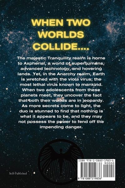 SOMETIMES EVEN SUPERPOWERS MAY NOT BE ENOUGH..... The majestic Tranquility realm is home to Axpherial, a world of super-humans, advanced technology, and hovering lands. Yet, in the Anarchy realm, Earth is wretched with the viola virus; the most lethal virus known to mankind. When two adolescents from these planets meet, they uncover the fact that both their worlds are in jeopardy. As more secrets come to light, the duo is stunned to find that nothing is what it appears to be, and they may not possess the power to fend off the impending danger. Get ready for a new YA fantasy full of immense action, beautiful romance, and the race against an evil that holds unwavering power to destroy entire worlds.
