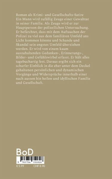 Roman als Krimi- und Gesellschafts-SatireEin Mann wird zufällig Zeuge einer Gewalttat in seiner Familie. Als Zeuge wird er zur Hauptperson der polizeilichen Untersuchung. Er befürchtet, dass mit dem Auftauchen der Polizei zu viel aus dem familiären Umfeld ans Licht kommen könnte und Schande und Skandal sein engstes Umfeld überziehen werden. Er wird von einem kaum auszuhaltenden Gedanken-, Erinnerungs-, Bilder- und Gefühlswirbel erfasst. Er hält alles tagebuchartig fest. Daraus ergibt sich ein scharfer Einblick in die eher unter dem Deckel gehaltenen persönlichen und dynamischen Vorgänge und Widersprüche innerhalb einer nach aussen hin heilen und idyllischen Familie und Gesellschaft.