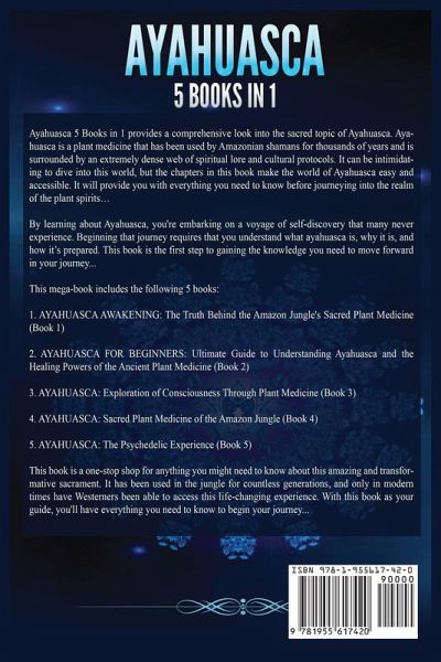 Ayahuasca 5 Books in 1 provides a comprehensive look into the sacred topic of Ayahuasca. Ayahuasca is a plant medicine that has been used by Amazonian shamans for thousands of years and is surrounded by an extremely dense web of spiritual lore and cultural protocols. It can be intimidating to dive into this world, but the chapters in this book make the world of Ayahuasca easy and accessible. It will provide you with everything you need to know before journeying into the realm of the plant spirits... By learning about Ayahuasca, you're embarking on a voyage of self-discovery that many never experience. Beginning this journey requires that you understand what ayahuasca is, why it is, and how it's prepared. This book is the first step to gaining the knowledge you need to move forward in your journey... This five-in-one series includes the following 5 books: 1. AYAHUASCA AWAKENING: The Truth Behind the Amazon Jungle's Sacred Plant Medicine (Book 1) 2. AYAHUASCA FOR BEGINNERS: Ultimate Guide to Understanding Ayahuasca and the Healing Powers of the Ancient Plant Medicine (Book 2) 3. AYAHUASCA: Exploration of Consciousness Through Plant Medicine (Book 3) 4. AYAHUASCA: Sacred Plant Medicine of the Amazon Jungle (Book 4) 5. AYAHUASCA: The Psychedelic Experience (Book 5) In this book you'll learn: What is Ayahuasca? The Origin of Ayahuasca History of Ayahuasca and how it became known in the West How to make and prepare Ayahuasca Ayahuasca for development What Ayahuasca is used for Different plants of Ayahuasca The power of Ayahuasca How Ayahuasca is traditionally administered Different uses of Ayahuasca and why one would choose a certain use The practical aspects of Ayahuasca The science behind Ayahuasca Effects of Ayahuasca in the body Controversy around Ayahuasca Pharmacology of Ayahuasca Shamanism and Ayahuasca The mysteries of Ayahuasca And so much more! This book is a one-stop shop for anything you might need to know about this amazing and transformative sacrament. It has been used in the jungle for countless generations, and only in modern times have Westerners been able to access this life-changing experience. With this book as your guide, you'll have everything you need to know to begin your journey! Grab your copy of Ayahuasca now!