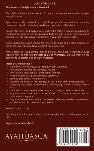 The Secrets of Enlightenment Revealed The rainforest is ancient, wise and it contains answers to questions that we often struggle to answer. Ayahuasca has the potential to unlock deep layers of personal understanding, healing and growth - all while providing an experience of the divine. People who have used Ayahuasca report that it offers a unique opportunity to "explore their inner selves". Its spiritual effects are said to be its most profound, allowing users to break down mental barriers and gain divine insights. In this riveting book, you'll explore the history and power of this plant medicine, as well as the science behind its remarkable healing properties. With a focus on the potential healing benefits, this book is sure to provide readers with insights into the potentials of Ayahuasca, and put them on the pathway to understanding its many mysteries. Inside you will discover:Should you try Ayahuasca? Burning questions answered A first-timer's guide to an Ayahuasca retreat How to find a real shaman - and not be scammed What to expect during an Ayahuasca ceremony Benefits, side effects + do's & don'ts Exploring the effects of Psychedelics on the human brain and physiology Everything you need to know about microdosing + how it affects mental health Magic Mushrooms, Peyote, Mescaline and more psychedelics explained Why the push to decriminalize psychedelics is growing + all you need to know about it's legality Why it's extremely important to understand what psychedelics may reveal to you about your own death and spirituality And much, much more Get ready to explore and discover the many gifts this incredible plant has to offer. Begin now with this book