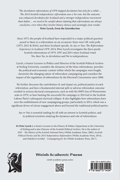 In Aye or Nae The Referendum Experience in Scotland 1979-2014, Peter Lynch investigates the three purely Scottish referendums when Scotland voted No, then Yes, to devolution and No to independence, and is essential reading for all with an interest in Scottish politics, and to political scientists studying the dynamics and role of referendums.