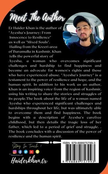 ""Ayesha's Journey: From Innocence to Resilience"" is a moving and uplifting memoir that tells the story of a young woman's struggles and triumphs. Growing up in the beautiful countryside of Kashmir, Ayesha's childhood was filled with joy and adventure. However, her world was shattered by the loss of her father, and Ayesha was forced to navigate betrayal, violence, and heartbreak as she grew older. Despite these challenges, Ayesha never lost her sense of hope or her fierce determination to rebuild her life. Her resilience and strength are an inspiration, and her story is a testament to the power of the human spirit to overcome even the greatest hardships. Through ""Ayesha's Journey,"" readers are encouraged to take action and fight for women's rights, combat abuse and discrimination, and make a positive difference in the lives of others. This powerful memoir is a reminder that hope and resilience can lead to a better tomorrow, no matter how difficult the journey may be.