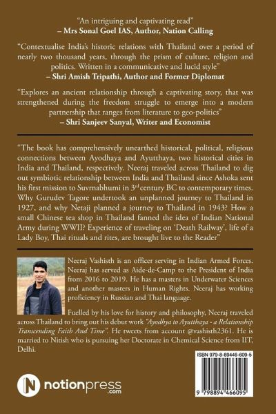 "The book has comprehensively unearthed historical, political, religious connections between Ayodhaya and Ayutthaya, two historical cities in India and Thailand, respectively. Neeraj traveled across Thailand to dig out symbiotic relationship between India and Thailand since Ashoka sent his first mission to Suvrnabhumi in 3rd century BC to contemporary times. Why Gurudev Tagore undertook an unplanned journey to Thailand in 1927, and why Netaji planned a journey to Thailand in 1943? How a small Chinese tea shop in Thailand fanned the idea of Indian National Army during WWII? Experience of traveling on 'Death Railway', life of a Lady Boy, Thai rituals and rites, are brought live to the Reader"