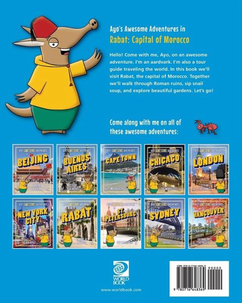 Join Ayo on an adventure. Ayo is an aardvark, an African mammal that eats ants and termites, and also a tour guide traveling the world. In this book, Ayo tours the city of Rabat. Rabat is the capital of the country of Morocco. Readers will walk though Roman ruins, sip snail soup, and explore beautiful gardens.