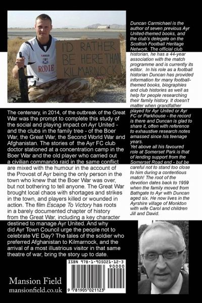 The centenary, in 2014, of the outbreak of the Great War was the prompt to complete this study of the social and playing impact on Ayr United - and the clubs in the family tree - of the Boer War, the Great War, the Second World War and Afghanistan. The stories of the Ayr FC club doctor stationed at a concentration camp in the Boer War and the old player who carried out a civilian commando raid in the same conflict are mixed with the humour in the account of the Provost of Ayr being the only person in the town who knew that the Boer War was over, but not bothering to tell anyone. The Great War brought local chaos with shortages and strikes in the town, and players killed or wounded in action. The film "Escape To Victory" has roots in a barely documented chapter of history from the Great War, including a key character destined to manage Ayr United. And why did Ayr Town Council urge the people not to celebrate VE Day? The tales of the soldier who preferred Afghanistan to Kilmarnock, and the arrival of a most illustrious visitor in that same theatre of war, bring the story up to date.