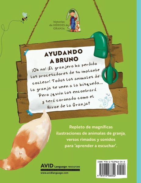 ¡Oh no! ¡El granjero ha perdido sus procesadores de voz! Todos los animales de la granja se unen a la búsqueda... pero ¿quién será el primero en encontrar los dispositivos y ser coronado como el héroe de la granja? Esta divertida historia rimada incorpora una amplia gama de sonidos de animales para "aprender a escuchar", mientras recorremos la granja en busca de los oídos mágicos perdidos de Bruno, el niño granjero. Este libro, magníficamente ilustrado con un adorable elenco de personajes de granja rebosantes de humor y personalidad, es ideal para los pequeños alumnos y primeros oyentes, ya sea para utilizarlo en casa o como recurso didáctico para las escuelas, profesores de sordos, terapeutas y logopedas. El libro puede utilizarse durante o como apoyo a las sesiones de logopedia y terapia verbal auditiva para practicar una amplia gama de sonidos ambientales, para aprender los nombres de los animales y para discutir por qué los diferentes personajes reaccionan de manera diferente y cómo se sienten. Se trata de un libro infantil inclusivo, con un personaje principal que es sordo, pero que no trata específicamente de la pérdida de audición - como tal, es una historia divertida y atractiva para cualquier niño. Bruno, el joven granjero de la historia, tiene pérdida auditiva, pero, sobre todo, es como cualquier otro niño, que se divierte en la granja con sus amigos animales. No obstante, en la historia se integran sutilmente algunos mensajes de concienciación sobre la sordera, lo que hace que el libro sea un recurso útil para los profesores convencionales que educan a sus alumnos sobre la pérdida auditiva. Al mismo tiempo, el libro permite que los niños sordos o con dificultades auditivas que utilizan implantes cocleares, audífonos u otra tecnología de ayuda a la audición se vean representados. Como dice la autora: "Una cosa que he aprendido como madre de una niña sorda es esto: #RepresentacionImporta no es solo una frase de moda sin sentido: ¡realmente importa y realmente marca la diferencia para nuestros hijos!" [Also available in English as "C.I. Quest" - a book for deaf and hard of hearing children, their friends, families and teachers - a tale of cochlear implants lost and found on the farm (the young farmer has hearing loss), told through rhyming verse packed with 'learning to listen' animal sounds for early learners]