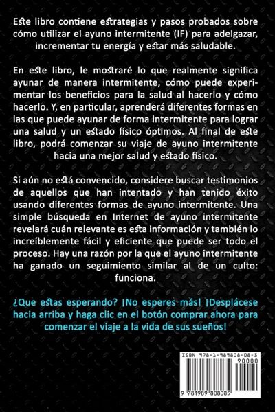 Este libro contiene estrategias y pasos probados sobre cómo utilizar el ayuno intermitente (IF) para adelgazar, incrementar tu energía y estar más saludable. En este libro, le mostraré lo que realmente significa ayunar de manera intermitente, cómo puede experimentar los beneficios para la salud al hacerlo y cómo hacerlo. Y, en particular, aprenderá diferentes formas en las que puede ayunar de forma intermitente para lograr una salud y un estado físico óptimos. Al final de este libro, podrá comenzar su viaje de ayuno intermitente hacia una mejor salud y estado físico. Si aún no está convencido, considere buscar testimonios de aquellos que han intentado y han tenido éxito usando diferentes formas de ayuno intermitente. Una simple búsqueda en Internet de ayuno intermitente revelará cuán relevante es esta información y también lo increíblemente fácil y eficiente que puede ser todo el proceso. Hay una razón por la que el ayuno intermitente ha ganado un seguimiento similar al de un culto: funciona. ¿Que estas esperando? ¡No esperes más! ¡Desplácese hacia arriba y haga clic en el botón comprar ahora para comenzar el viaje a la vida de sus sueños!