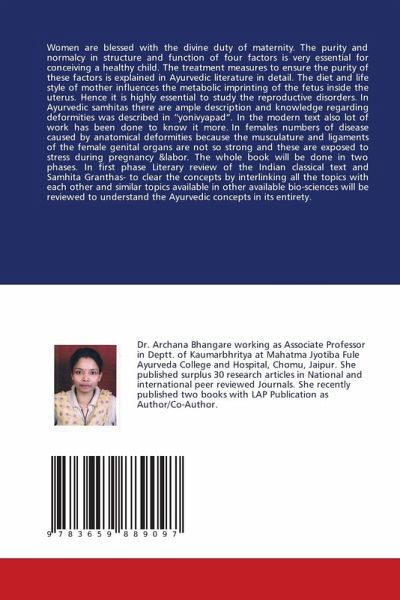 Women are blessed with the divine duty of maternity. The purity and normalcy in structure and function of four factors is very essential for conceiving a healthy child. The treatment measures to ensure the purity of these factors is explained in Ayurvedic literature in detail. The diet and life style of mother influences the metabolic imprinting of the fetus inside the uterus. Hence it is highly essential to study the reproductive disorders. In Ayurvedic samhitas there are ample description and knowledge regarding deformities was described in "yonivyapad". In the modern text also lot of work has been done to know it more. In females numbers of disease caused by anatomical deformities because the musculature and ligaments of the female genital organs are not so strong and these are exposed to stress during pregnancy &labor. The whole book will be done in two phases. In first phase Literary review of the Indian classical text and Samhita Granthas- to clear the concepts by interlinking all the topics with each other and similar topics available in other available bio-sciences will be reviewed to understand the Ayurvedic concepts in its entirety.