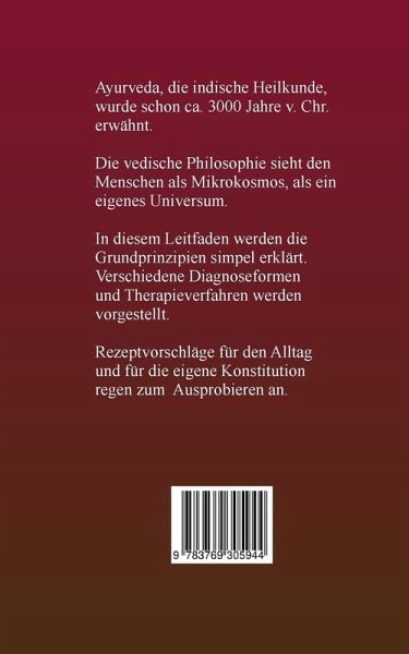 Ayurveda, die indische Heilkunde, wurde schon ca. 3000 Jahre v. Chr. erwähnt. Die vedische Philosophie sieht den Menschen als Mikrokosmos, als ein eigenes Universum. In diesem Leitfaden werden die Grundprinzipien simpel erklärt. Die persönliche Konstitution kann ermittelt werden. Verschiedene Diagnoseformen und Therapieverfahren werden vorgestellt. Rezeptvorschläge für den Alltag und für die eigene Konstitution regen zum Ausprobieren an.