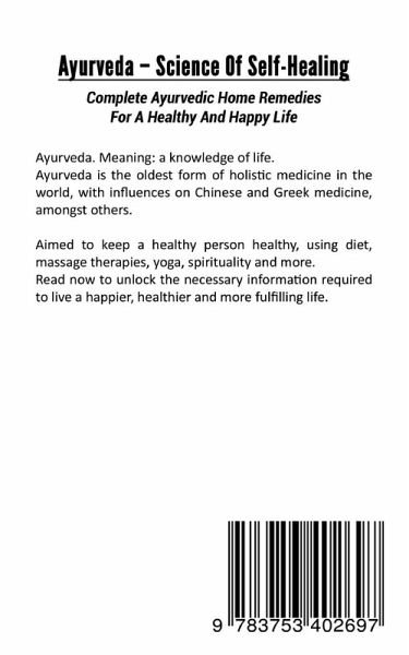 Ayurveda - Science Of Self-HealingComplete Ayurvedic Home Remedies For A Healthy And Happy LifeAyurveda. Meaning: a knowledge of life.Ayurveda is the oldest form of holistic medicine in the world, with influences on Chinese and Greek medicine, amongst others.Aimed to keep a healthy person healthy, using diet, massage therapies, yoga, spirituality and more.Read now to unlock the necessary information required to live a happier, healthier and more fulfilling life.