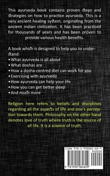 This ayurveda book contains proven steps and strategies on how to practice ayurveda. This is a very ancient healing system, originating from the ancient indian civilization. It has been practiced for thousands of years and has been proven to provide various health benefits. A book which is designed to help you to understand: ¿ What ayurveda is all about ¿ What doshas are ¿ How a dosha-centred diet can work for you ¿ Exercising with ayurveda ¿ How ayurveda can help your life ¿ How you can get better sleep ¿ And much more Religion here refers to beliefs and disciplines regarding all the aspects of life and one's perception towards them. Philosophy on the other hand denotes love of truth where truth is the source of all life. It is a science of truth.