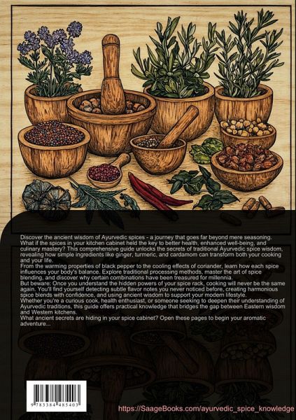 Discover the ancient wisdom of Ayurvedic spices and herbs in this comprehensive guide to traditional seasonings and their healing properties. This practical book about spices combines centuries-old knowledge with modern applications, making it accessible for both cooking enthusiasts and health-conscious readers.The guide begins with fundamental principles of Ayurvedic spice usage, explaining the six essential tastes (sweet, sour, salty, pungent, bitter, and astringent) and their effects on body and mind. Learn about the thermal qualities of herbs and spices and how they influence your well-being.Detailed chapters cover root spices like ginger and turmeric, seeds and fruits including cardamom and coriander, and precious bark and flower spices such as cinnamon and saffron. Each entry provides information about traditional uses, preparation methods, and medicinal properties.Practical sections guide you through:- Traditional processing and storage techniques- Principles of spice combinations- Balanced mixing ratios- Proper timing of spice addition- Roasting and grinding methods- Creating spice pastesThe book features essential charts for kitchen use, showing:- Seasonal spice recommendations- Dosha-specific herbs and spices- Healing properties of common seasonings- Compatible spice combinationsWhether you're exploring Ayurvedic cooking, seeking natural remedies, or simply wanting to enhance your culinary repertoire, this herb and spice book provides clear guidance for incorporating these powerful ingredients into your daily life.Includes modern interpretations of classic spice blends and international fusion combinations, helping readers bridge traditional wisdom with contemporary cooking styles.This book was created using innovative technologies such as Artificial Intelligence and specially developed tools - for example, in brainstorming, research, writing, editing, quality assurance, and the design of decorative illustrations.In this way, we want to offer you a particularly coherent, modern, and even higher-quality reading experience.